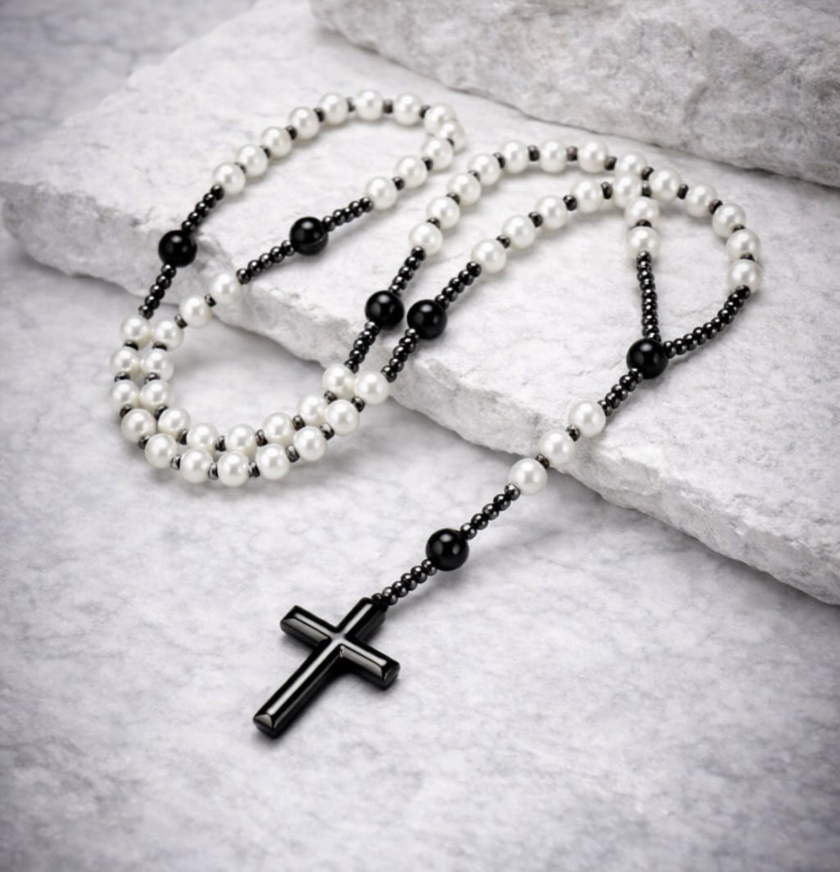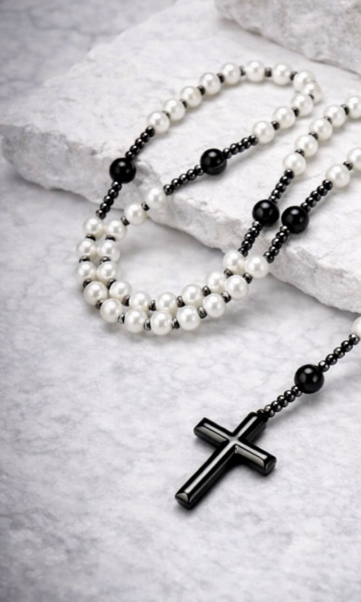 Elegancki męski różaniec wykonany z naturalnego onyksu, hematytu oraz pereł rzecznych to połączenie klasyki, duchowości i nowoczesnej estetyki. Głęboka czerń onyksu symbolizuje siłę i ochronę, hematyt dodaje wyrazistego, metalicznego akcentu, natomiast perły rzeczne wprowadzają subtelny kontrast i ponadczasową elegancję.