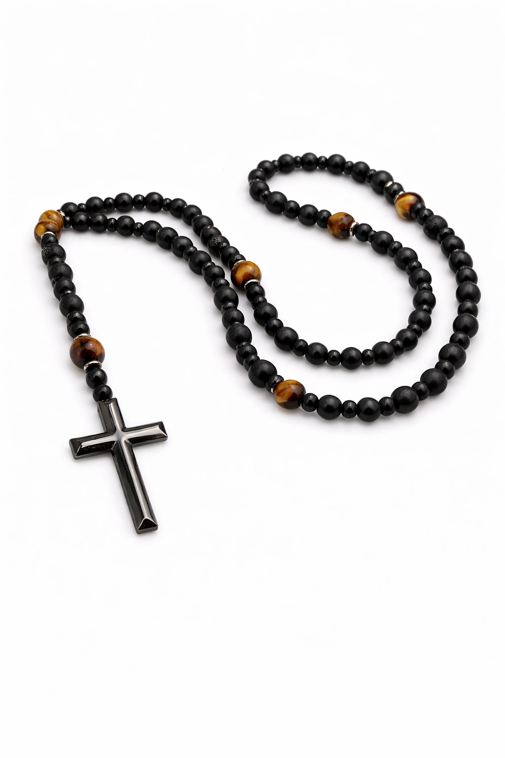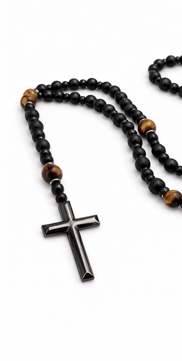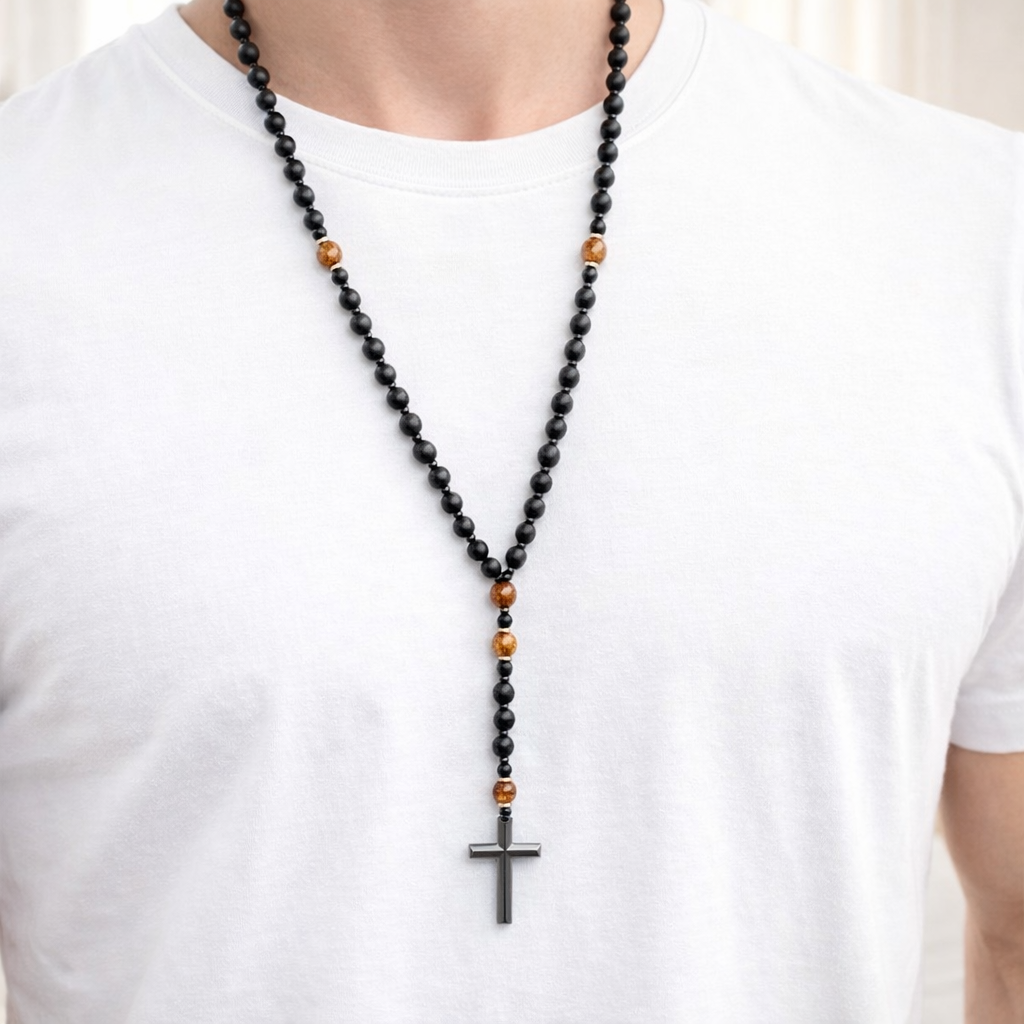 Lawa wulkaniczna symbolizuje siłę, stabilność i odwagę, tygrysie oko kojarzone jest z pewnością siebie i ochroną, natomiast hematyt dodaje charakteru i nowoczesnej elegancji. Całość dopełnia srebrny krzyż, który stanowi mocny, symboliczny akcent oraz podkreśla indywidualny styl biżuterii.