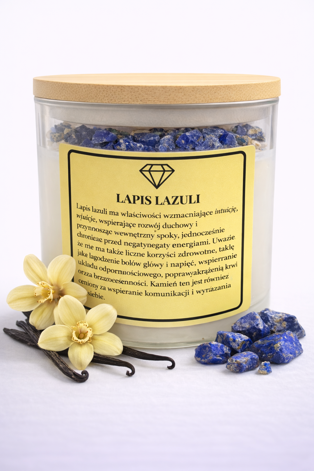 W świecy znajduje się lapis lazuli – minerał symbolizujący mądrość, wewnętrzny spokój i harmonię. Jego obecność nadaje świecy wyjątkowego charakteru i podkreśla jej naturalny oraz elegancki styl.