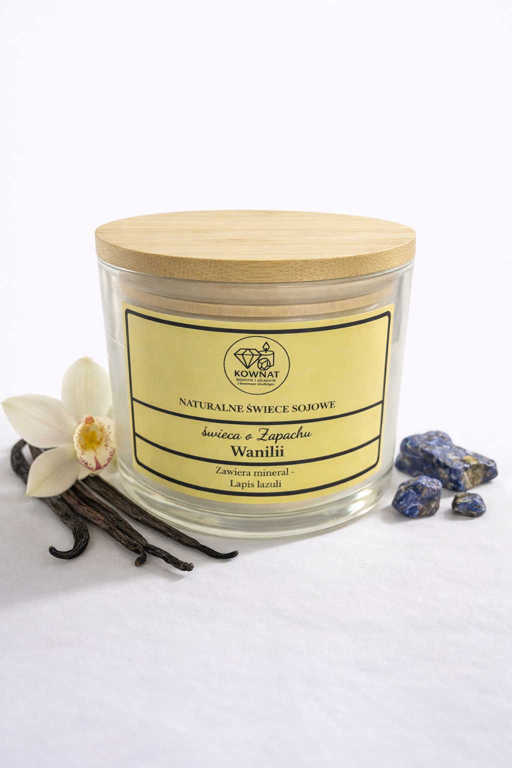 Naturalna świeca sojowa o zapachu wanilii z drewnianym knotem i lapis lazuli. Ciepły, słodki aromat tworzy przytulną atmosferę.